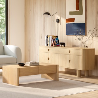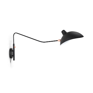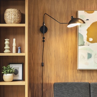 Lamps of a feather, styled together. Drawing from mid-century lines, the Leap sconce swivels on a sharply curved arm and adjustable shade so you can direct the light however you like.
