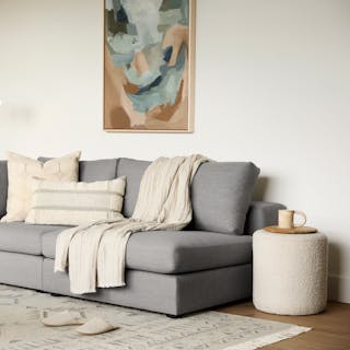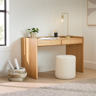The Faydra Mini Desk x Cilo Ottoman Bundle combines function and style for compact spaces. The Faydra Mini Desk features an avant-garde sloping design, sturdy construction, and a spacious, veneered drawer with a solid ash handle—perfect for stashing away work mess at the end of the day. Paired with the Cilo Ottoman in Sandstone Wool Bouclé—petite, comfy, and unexpectedly tough—this bundle makes workspaces both practical and irresistibly charming.