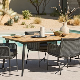 Intimate gathering. The Latta table for 6 is perfect for an easy family dinner in the backyard. Burgers, a solid wood acacia top, beers, a powder-coated aluminum frame, chips and dips, a center hole for an umbrella: this Latta’s got all the fixin’s for a great meal outside.