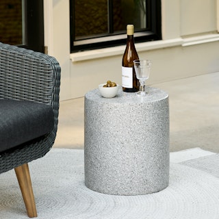 Get a little al fresco factime with your favorite person. The Aeri Lounge chairs are lthe perfect place to sit and connect with your pals, partner, or pup. Woven from matte resin wicker, set on a black metal frame, the chairs are also supremely easy to clean and care for. Same goes for the Solina: poured from terrazzo concrete, all you need is a damp cloth and 5 minutes.