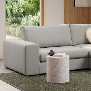 Get a little al fresco factime with your favorite person. The Aeri Lounge chairs are lthe perfect place to sit and connect with your pals, partner, or pup. Woven from matte resin wicker, set on a black metal frame, the chairs are also supremely easy to clean and care for. Same goes for the Solina: poured from terrazzo concrete, all you need is a damp cloth and 5 minutes.