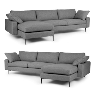 The Nova is a study in harmonious opposites: a deep, cozy sofa set atop dainty legs. Sharp angles, soft pillows. A commanding presence, but with a chaise that can be attached to either side, also very flexible.