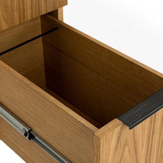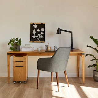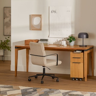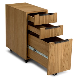 Minimal, sleek, timeless — what else can we say? This bundle features everything you need for your 9-5 grind. Happily nestled below its big-sibling desk is the Madera File Cabinet, with a slim profile and four locking wheels, this helpful office companion allows you to tailor your under-desk space to suit your needs. Along with the expansive open desktop space of the Madera Desk, you'll always have room when the documents start to pile up. And if they do? Throw them in the file cabinets' vertical file drawer.