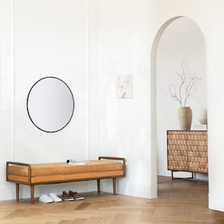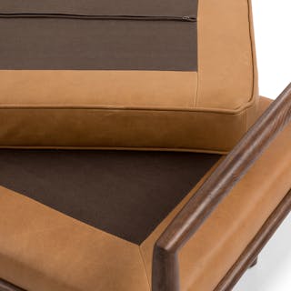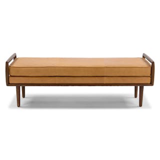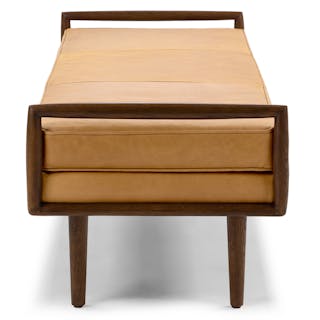 So atypical. With clean lines and a square silhouette typical of mid-century modern design, the Ansa Bench is anything but typical. Square walnut arms frame the simple, piped-edge leather seat atop tapered wooden legs.