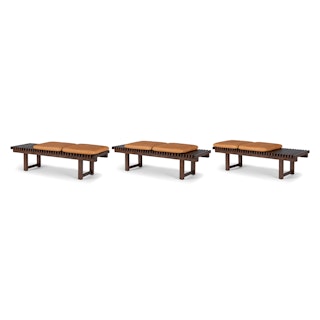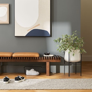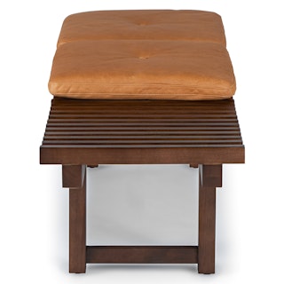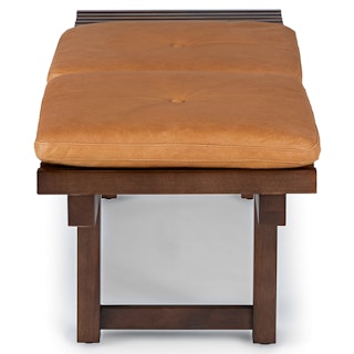 The Ripa Bench is a sleek new spin on an iconic mid-century design. The slatted seat inspires feelings of serenity, and is low enough to be used as a unique coffee table. Made with a solid wood, walnut-stained frame topped off with two tan leather cushions, the Ripa works as extra seating for your impromptu dinner party or as the most stunning catchall at the end of your bed.
