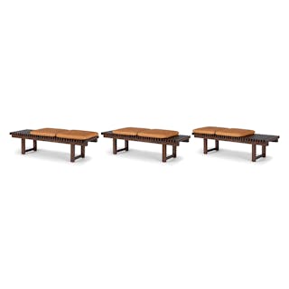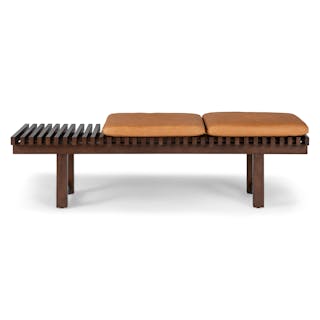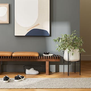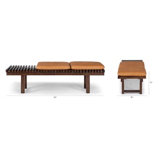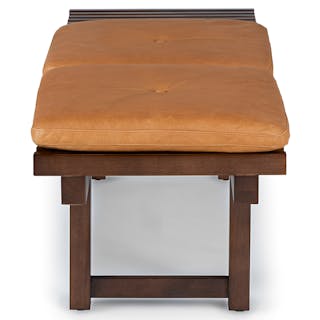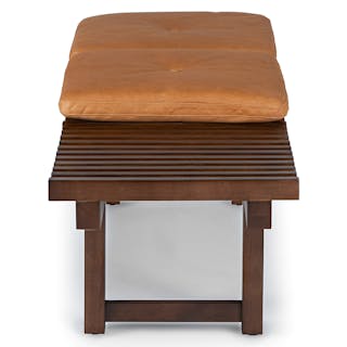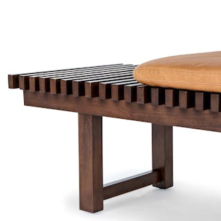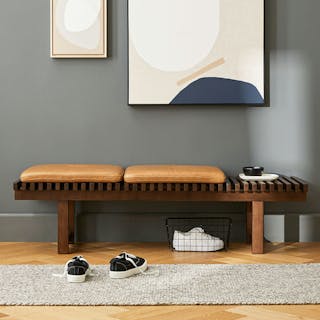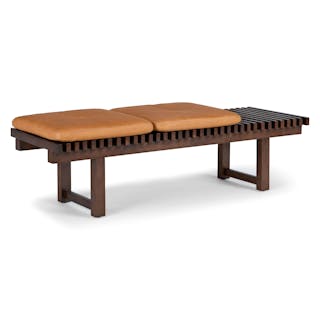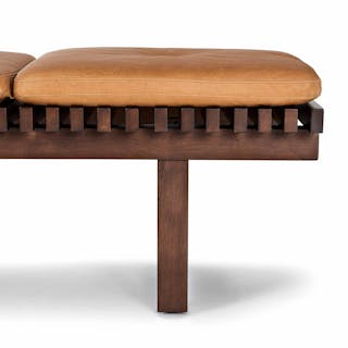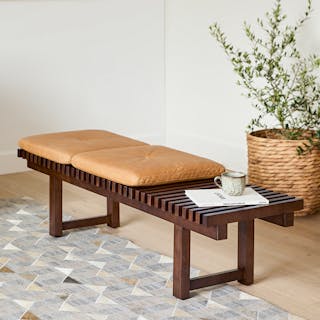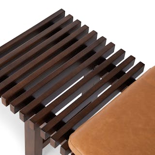 The bench revolution. The Ripa bench is a sleek new spin on an iconic mid-century design. The slatted seat inspires a sense of serenity and is low enough to serve as a unique coffee table. Made with a solid wood, walnut-stained frame topped off with two tan leather cushions, the Ripa works as extra seating for your impromptu dinner party or as the most stunning catchall at the end of your bed.