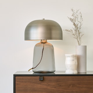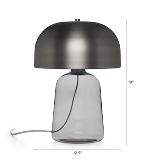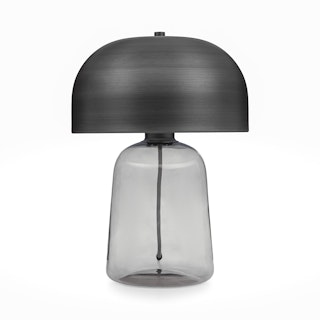 A fun guy. The Koepel table lamp features an iconic retro mushroom shape in an upscale 21st century style. With a gunmetal finished dome top and smoked glass base, the Koepel is ready to illuminate your late-night strokes of genius or add distinguished ambience to your evening whiskey tastings. Groovy, baby.