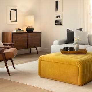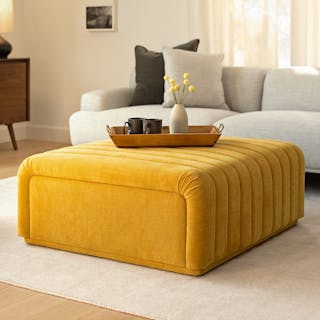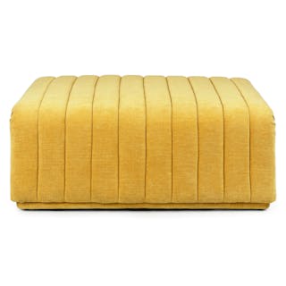 Vibrantly modern. Designed with thick upholstered channels cascading across the top and down each side, the Sefto Ottoman summons the spirit of a vintage cocktail lounge, adding playful texture and color to any space. Anchored by a solid wood frame, this ottoman is plush enough for comfortable seating (or tired feet) yet firm enough to function as a surface for books or a tray of drinks — just the right fit for a space in need of a mid-century modern lift.