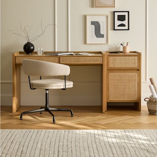 Our Deca bundle is the contemporary 9-5 workstation updated with natural box cane fronts, curved edges, and waterfall legs for a sophisticated yet breezy look. Perfect for those who appreciate the attention to detail. Designed to fit side by side seamlessly, the Deca bundle offers features to improve your workday, like cabinet hardware that allows you to install its door to open left or right and a concealed cable management compartment to hide all those unsightly wires. The Deca is here to help get you through to closing time.
