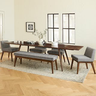 The super long Seno Table comes fully prepared to host everyone (seriously, invite everyone). It extends easily to comfortably fit all your guests and is no stranger to making room for more. Paired with the richly upholstered, generously padded Chanel dining chairs and bench, you won't need to clink a glass or make a speech to get people's attention.
