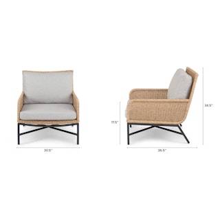 Subtle, swanky, and sleek by design. The Tody Lounge Chair doesn’t have to show off to get noticed. The slight curve of enveloping arm rests and tightly woven faux rope trim elevates the design of this classic faux wicker chair. A crisscrossed powder-coated steel frame and loose cushions upholstered in UV and stain resistant fabric add the kind of durability and contemporary finesse ideal for both outdoor and indoor dining.