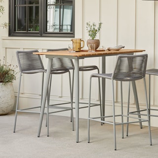 Crafted with woven, fade-resistant polypropylene rope atop a solid metal frame, the Zina Bar Stool Bundle features two of our durable, fan-favorite stools, enough for your happiest hours outside. The streamlined silhouette keeps the look modern, while the seat and back provide structure and support.