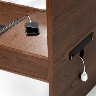 Behind closed doors. Designed to peek out from behind the comfort of a pillow-adorned mattress, the headboard of the low-profile Nera Bed, designed with a subtle chevron pattern, brings a natural warmth to any bedroom. Nightstand extensions featuring discreet cord management and soft-close drawers add a practical mid-century modern flair. Constructed of solid wood and wood veneer, the Nera Bed with Nightstands features two powder-coated steel legs at the foot of the bed for extra stability.