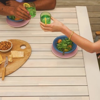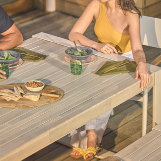 Minimal design meets maximum appeal. Constructed of solid slatted Acacia wood and industrial powder-coated steel legs, the Lubek Dining Set carries some serious weight (figuratively and literally). Including the Lubek Dining Table and two Lubek Benches, this stately dining set makes for an impressive centerpiece for any outdoor or indoor gathering.