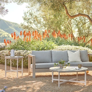 Made of teak and powder-coated metal, the Haskel Side Table’s chunky solid wood top is designed with a symmetrical center seam that helps encourage water drainage when used outdoors. Good looking and smart? Talk about a winning combination.