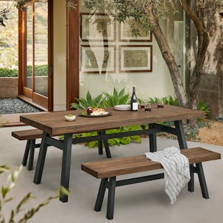 Take a seat. With powder-coated aluminum legs and a chunky slatted teak top, the Sardis Bench is sleek, sturdy, and supportive. What more could you ask for from a bench? That it conveniently tucks into the accompanying Sardis Dining Table? No problem. This bench does it all.