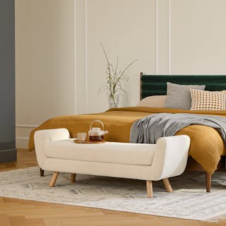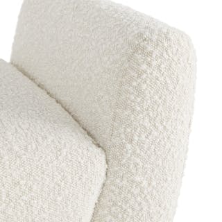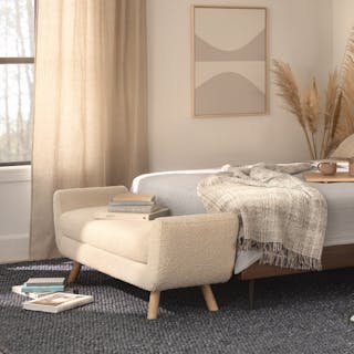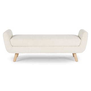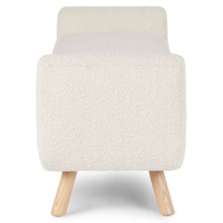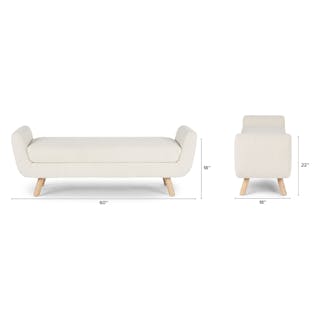 - Upholstered in a soft, non-absorptive bouclé fabric. Bouclé is an excellent choice for those who want an easy-to-care-for, style-forward bench.