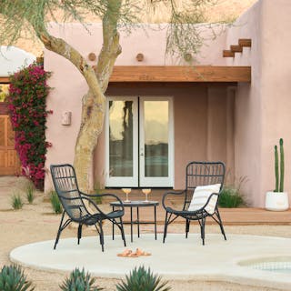 Inspired by the popular rattan furniture of the 1950s and 1960s, this modernized chair is handcrafted using traditional weaving techniques with new and improved materials. Woven from a more durable, technically advanced synthetic wicker, the Medan chair is an excellent outdoor furniture option, able to withstand fluctuating temperatures without cracking, splintering, or corroding. Paired with the compact and durable Gera, this side table is the perfect sidekick for Medan. Where have your sunglasses gone? They’re right there, on the Gera’s super cool and smooth granite top.