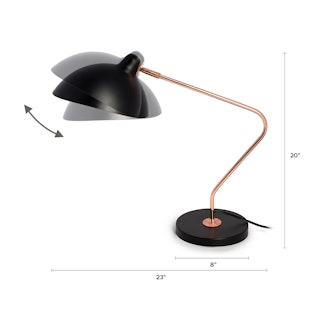 The crescent-shaped metal shade and sharply curved stand draw inspiration from an iconic mid-century design. Leap has an easily adjustable shade that directs light exactly where you want it, perfect for a home office or reading nook. Its stylish finishes combine matte and polished metal, adding new life to the classic design.