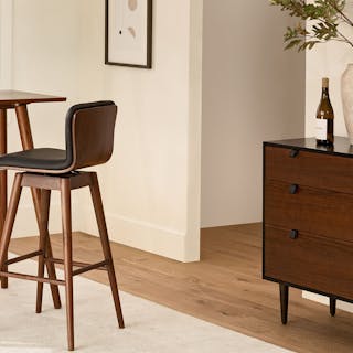Turn your day around. A total mid-century modern dream seat, our Sede Swivel Bar Stool proves that good design always comes full circle. Tapered solid wood legs? Check. Bentwood seat? Absolutely. With a low, exposed veneer back, the Sede helps you lean into small talk or deep into conversation with confidence. Cheers to that.
