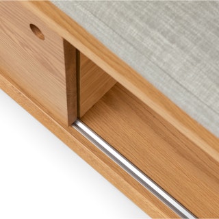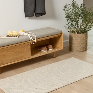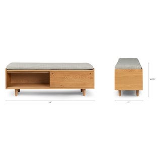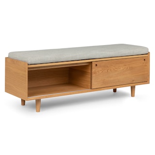 Put it away, put it away, put it away, now. The Nederin bench is the beautiful workhorse that your foyer or mudroom deserves. A broad storage compartment is accessed by a sliding solid wood panel so you can show-off your shoe collection at your leisure. Topped with a cozy foam cushion, the Nederin bench can also act as extra seating, in a pinch.
