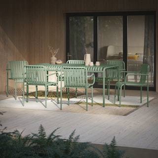 Stripes are always in. The Sarek's clean, modern shape and fun banded details make for a fun, functional backyard addition. With mix-and-match chairs, the Sarek Dining set is Instagram ready and primed to receive your spritzes, chip bowls, and various dips.