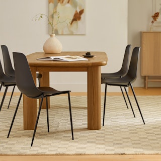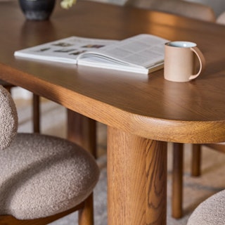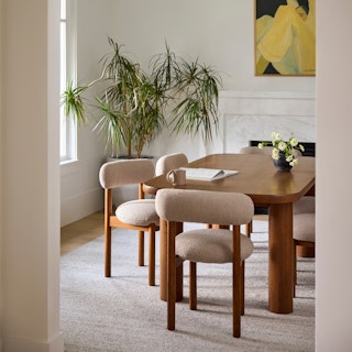 A simple form that's more than the sum of its parts, the Gourmet Gathering Bundle is boldly sculptural. With a strong, solid foundation of solid wood, this bundle is set apart by the Munk dining chair's round tuffet of bouclé and foam filling. With a slightly curved backrest and rounded table edges, this bundle makes for one restful spot to relax at.