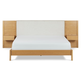 Studied simplicity. The Cassie bed is composed of simple lines and beautiful materials. With solid wood details, an upholstered headboard, built in nightstands, the Cassie's studied simplicity looks great draped with a vintage quilt, or with your favorite linen duvet.