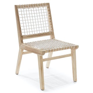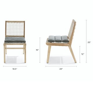 Solid construction and a bold design makes this an outdoor heirloom dining piece. Left raw with no chemical sealants, the true character of 100% teak is evident. A resilient eco-friendly resin webbing spans the seat and back of this chair, with added padding from a loose cushion. As it ages, teak will naturally develop a stunning silvery gray color. Our teak is traceable and certifiably sourced. Chairs are sold and shipped in pairs. Price is shown per chair