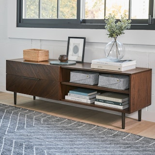 The TV might be on, but all eyes are on the Nera Media Unit. Made with veneered walnut in a subtle chevron wood grain pattern, the Nera brings rich, but never stuffy, style to your space. Need a place to stash that DVD season of that small-town romance you can’t seem to part with? Two soft-close drawers are just the spot. Want to show off your smartest-looking books? There’s a fixed shelf at the perfect height so you can do just that.