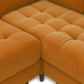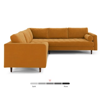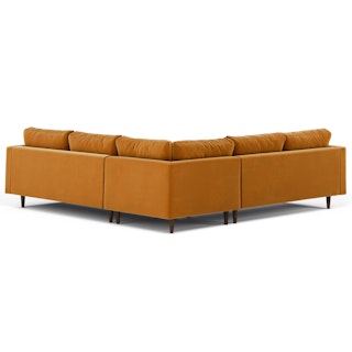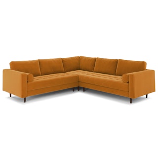 How does a person balance extravagance and practicality? With a velvet sectional sofa, obviously. With lux brushed velvet, loose back cushions and bolsters, and solid wood legs, there’s a reason this is our most popular sofa. A corner blocked wooden frame and slim walnut legs make for a sturdy and stylish movie-watching companion — pair with a smattering of tropical plants and coffee in a pretty mug.