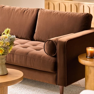 How does a person balance extravagance and practicality? With a velvet sectional sofa, obviously. With lux brushed velvet, loose back cushions and bolsters, and solid wood legs, there’s a reason this is our most popular sofa. A corner blocked wooden frame and slim walnut legs make for a sturdy and stylish movie-watching companion — pair with a smattering of tropical plants and coffee in a pretty mug.
