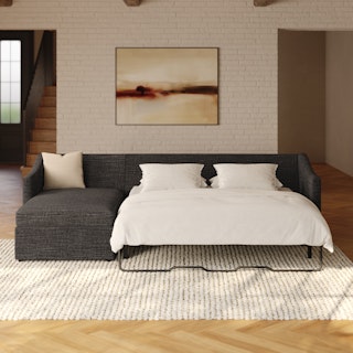 A minimal look with maximum impact... and maximum function. The Landry Sofa Bed marries laid back comfort with elegant details to produce a sofa that is as comfortable hosting movie night as it is your in-laws. Sloping sleigh-style arms and clean, straight lines make it simple to pair this sofa with many styles. With a spacious chest hidden below its chaise seat, and pull-out memory foam mattress, this sofa bed is compact, functional, and comfortable. Almost too comfortable.
