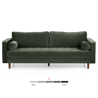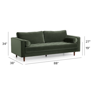 Maximum mid-century appeal. With its plush back cushions, bolsters made for regal lounging, and tufted bench seat, this velvet version of our Sven Sofa puts your calm, cool, creative style on display. This piece is poised on a wooden block frame and upholstered in soft brushed velvet. Pair this piece with a good book: the perfect combo for unwinding after a long day.
