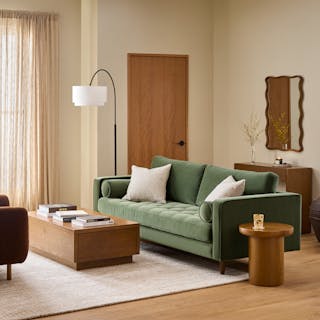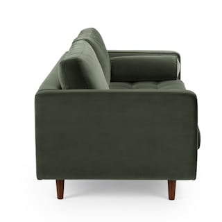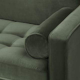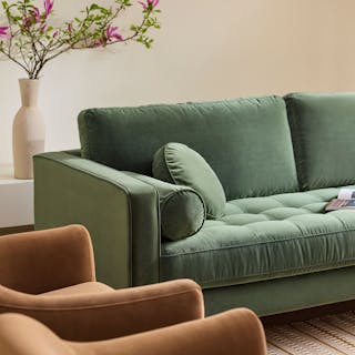 Maximum mid-century appeal. With its plush back cushions, bolsters made for regal lounging, and tufted bench seat, this velvet version of our Sven Sofa puts your calm, cool, creative style on display. This piece is poised on a wooden block frame and upholstered in soft brushed velvet. Pair this piece with a good book: the perfect combo for unwinding after a long day.