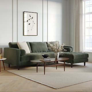 How does a person balance extravagance and practicality? With a velvet sectional sofa, obviously. With lux brushed velvet, loose back cushions and bolsters, and solid wood legs, there’s a reason this is our most popular sofa. A corner blocked wooden frame and slim walnut legs make for a sturdy and stylish movie-watching companion — pair with a smattering of tropical plants and coffee in a pretty mug.