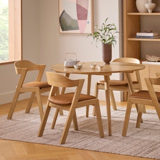 Pictured is the Conan round table 54”, and six Meja leather dining chairs. Both are Excellent quality, easy to assemble, and sturdy.