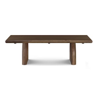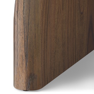 Welcome, Lloyd, the gentle giant. With a solid wood construction throughout, Lloyd's rustic charm comes from its wire-brushed finish, accentuating the natural wood grain and giving the piece a highly texturized look and feel. Its sizeable top rests boldly atop two arched plinth legs, offering a striking contrast against its soft, rounded edges. Lloyd is visually bold but soft at heart.
