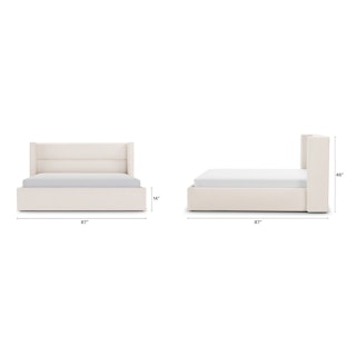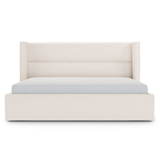 The CEO of dreamland. This generous wing-backed headboard has some pretty high expectations of your REM cycle. Upholstered with a linen-blend and padded with dense foam, the Calabri bed also features a generous upholstered base. Talk about an elevated aesthetic.