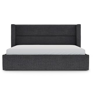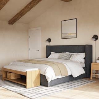The CEO of dreamland. This generous wing-backed headboard has some pretty high expectations of your REM cycle. Upholstered with a linen-blend and padded with dense foam, the Calabri bed also features a generous upholstered base. Talk about an elevated aesthetic.
