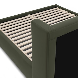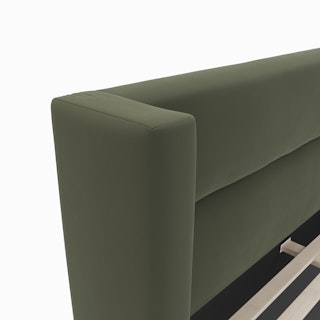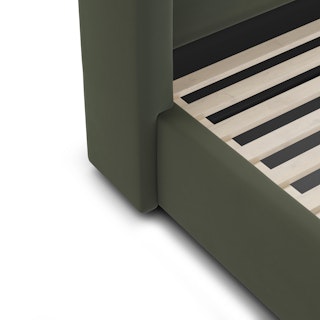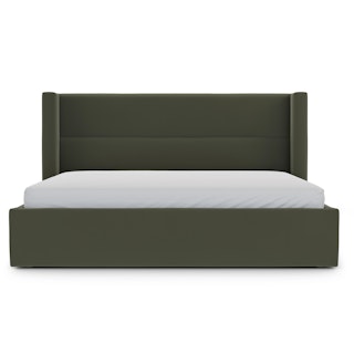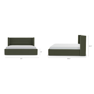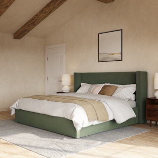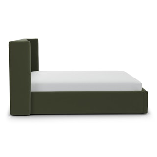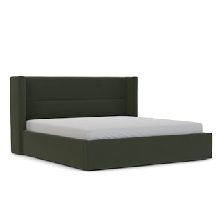 The CEO of dreamland. This generous wing-backed headboard has some pretty high expectations of your REM cycle. Upholstered in our durable Hale velvet and padded with dense foam, the Calabri bed also features a generous upholstered base. Talk about an elevated aesthetic.