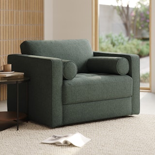 You know what they say: if you can't beat 'em, make the extremely cozy lounge chair into a sleeper lounge. People kept falling asleep on the Sven, so we've cut out the middle man and made the Sven Sleeper Lounge Chair. A tufted seat, precise piping, and round bolster pillows, plus! Plus! A fold out mattress so you can take your Sven lounge into a Sven nap. Stick that in your living room and sleep on it.