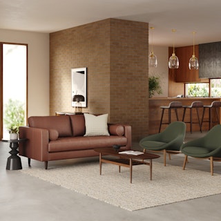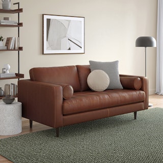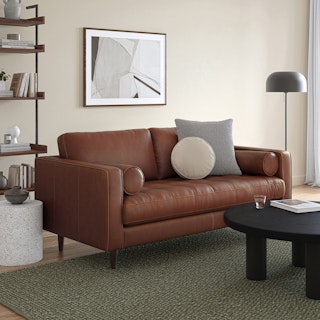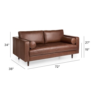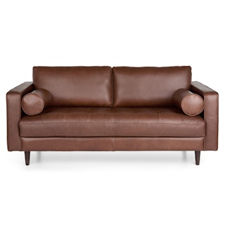 Snuggle up with your favorite pet on the loveseat version of our Sven Sofa. Built on a sturdy corner-blocked wooden frame, it's perfect for small spaces. With a comfy tufted bench seat, luxuriously plump back cushions, and matching round bolsters at either end, you get all the comfort of a full sized couch, but better space economy. Natural color variations, wrinkles and creases are part of the unique characteristics of full-aniline leather. It will develop a relaxed vintage look with regular use.