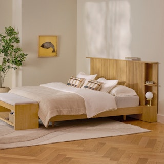 Make space with the Kouva bedroom bundle. With its unique solid oak tambour design and modern open shelving, the Kouva is ready to house your book collection, your empty water glasses, your alarm clock, and a midnight snack. And the Basi? It's just happy to hold your mattress.