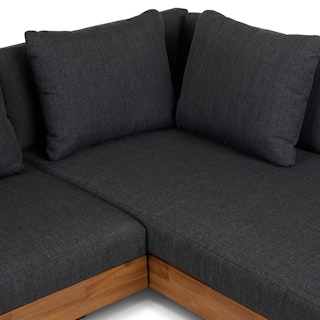 Stay a while. The Lubek sectional is built from a solid acacia wood base. The sofa is set close to the ground, encouraging you to really sink into (or even lie down on) those weather-resistant cushions. Dark cushions and super clean lines add to the Lubek’s modern look, while the warmth of the acacia wood makes the sofa easy to pair with any backyard set up. We call this look “low key modernism."