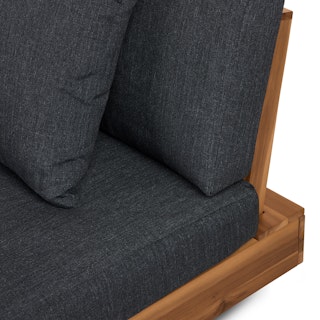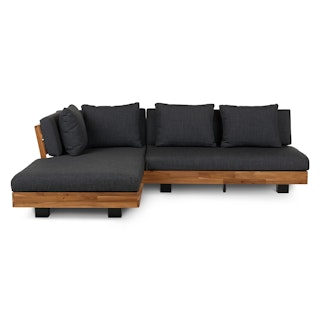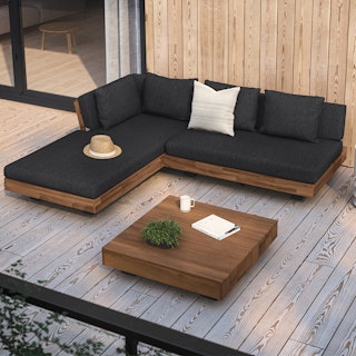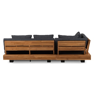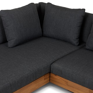 Stay a while. The Lubek sectional is built from a solid acacia wood base. The sofa is set close to the ground, encouraging you to really sink into (or even lie down on) those weather-resistant cushions. Dark cushions and super clean lines add to the Lubek’s modern look, while the warmth of the acacia wood makes the sofa easy to pair with any backyard set up. We call this look “low key modernism."