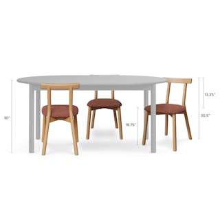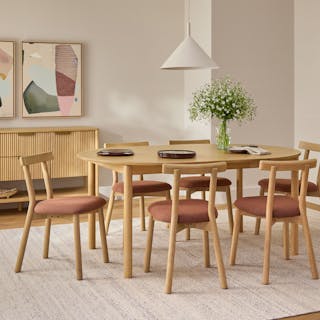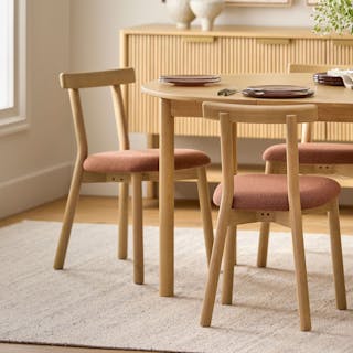 The Dine and Unwind Bundle embodies all the light and airy qualities of the Scandi design style. The Ulka chair features a curved backrest that seamlessly integrates with the rounded-edge frame of the Heidi table, making the desire to remain at the table strong — even well past dinner's end. Made from solid and veneered wood, this bundle reflects a minimal, soft, and compact aesthetic, effortlessly embracing its Scandinavian roots.