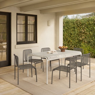 Stripes are always in. The Sarek's clean, modern shape and fun banded details make for a fun, functional backyard addition. With mix-and-match chairs, the Sarek Dining set is Instagram ready and primed to receive your spritzes, chip bowls, and various dips.