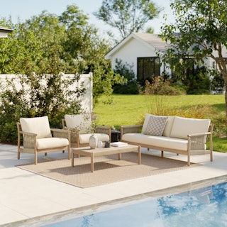 More than just a pretty face. The Rosa is built from solid eucalyptus wood, with dowelled legs and bracing. And the cushions — not only are they high-density foam, but they are upholstered with UV- and water-resistant fabric. With airy criss-cross weave details, the Rosa is as pretty as she is comfortable. And she is really, really comfortable.