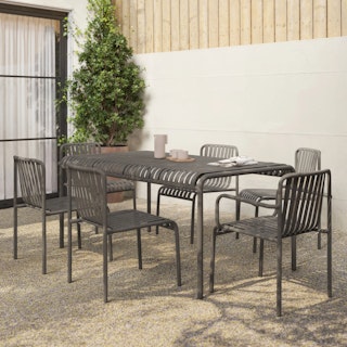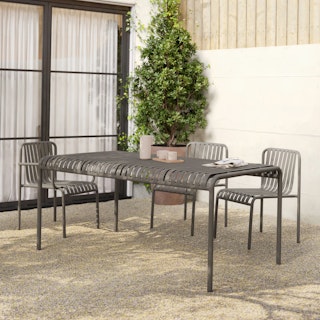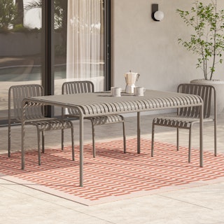 Stripes are always in. The Sarek's clean, modern shape and fun banded details make for a fun, functional backyard addition. With mix-and-match chairs, the Sarek Dining set is Instagram ready and primed to receive your spritzes, chip bowls, and various dips.